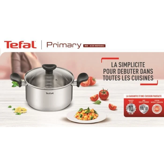 e3090704 – poêle inox 30cm – Découvrez la poêle Tefal Primary E3090704 pour cuisiner à la maison en toute simplicité ! Des possibilités de cuisson infinies sont à votre portée grâce à sa conception en acier inoxydable 18/10, avec une qualité sur laquelle vous pouvez compter jour après jour. Cette poêle a été conçue pour tout cuisiner, de l’omelette moelleuse au steak haché juteux, offrant le résultat idéal en toute occasion. Commencez à cuisiner en un rien de temps, grâce à des caractéristiques bien pensées pour une totale tranquillité d’esprit.Poêle Primary, pour cuisiner en toute simplicitéAvec Tefal Primary, nous avons tout prévu pour vous. Cette poêle sûre et facile à utiliser a été conçue pour faciliter la cuisine au quotidien. Vous pourrez réaliser de nouvelles recettes en toute simplicité grâce à sa conception intelligente : un revêtement antiadhésif durable et la technologie Thermo-Signal®. L’acier inoxydable 18/10 robuste garanti 10 ans pour une qualité à laquelle vous pouvez faire confiance, est associé à des caractéristiques pratiques comme la poignée qui ne chauffe pas pendant l?utilisation de la poêle. Découvrez des ustensiles de cuisine à utiliser dans une totale tranquillité d’esprit jour après jour. Cette poêle bien conçue ajoute une touche de santé à vos repas : poulet grillé pour la salade César, quesadillas irrésistibles et bien d’autres encore, sans besoin d?ajouter de matière grasse ou d?huile grâce à son revêtement. Pour une cuisine maison sans compromis sur la saveur, la poêle Primary est votre alliée pour obtenir de délicieux résultats au quotidien.Inox de première qualité, garanti 10 ansMaîtrisez l’art de cuisiner en toute sérénité grâce à une garantie de 10 ans couvrant le meilleur de l’acier inoxydable et une fabrication experte, pour un maximum de robustesse, de durabilité et de plaisir de cuisiner sans risque de déterioration dans le temps.Revêtement antiadhésif TITANIUMLe revêtement antiadhésif de haute qualité TITANIUM est durable et résistant grâce à sa structure ultra renforcée et à un revêtement de protection renforcé de Titane.Notre engagement : cuisiner sainement en toute confiance Notre objectif est de fabriquer des produits performants qui durent des années pour vous garantir une cuisson saine et sûre. Nos revêtements sont testés sûrs (sans PFOA, sans plomb, sans cadmium).THERMO-SIGNAL?: maîtrise parfaite de la températureLa technologie Thermo-Signal? indique la température idéale de démarrage de cuisson pour garantir une texture, une couleur et un goût parfaits pour de délicieux repas chaque jour.Technologie de fond inductionProfitez d’une diffusion parfaite de la chaleur et d’une cuisson homogène jour après jour, grâce à la base épaisse et résistante qui empêche toute déformation dans le temps.Poignée ergonomiqueLa poignée ergonomique assure une prise en main confortable lors de la cuisson. Elle reste froide même pendant la cuisson.Compatible tous feux dont inductionCompatible avec plaques de cuisson à gaz, électrique, vitrocéramique et induction.Tefal®, N°1 mondial des articles culinairesTefal® s’efforce de garantir des résultats de cuisson parfaits chaque fois que vous entrez dans votre cuisine – une raison de plus de choisir Tefal®.Eco-conseil : une cuisson économe en énergieLa technologie Thermo-Signal? indique la température exacte de démarrage de cuisson et évite tout gaspillage d’énergie en garantissant que votre plaque de cuisson ne chauffe pas trop longtemps.Eco-conseil : une cuisson plus rapideEn coupant vos aliments en petits morceaux, vous obtiendrez des résultats de cuisson plus rapides, vous économiserez du temps et de l’énergie.Eco-conseil : une cuisson éco-responsableLa gamme TEFAL vous permet de cuisiner sans ajout de beurre. C’est bon pour votre santé et pour l’environnement. La réduction de la consommation de protéines animales, y compris les produits laitiers comme le beurre, est essentielle pour diminuer notre impact sur l’environnement. – Type de produit : Poêle à frire.