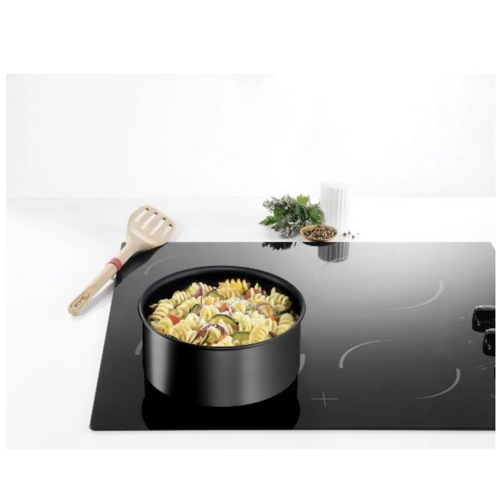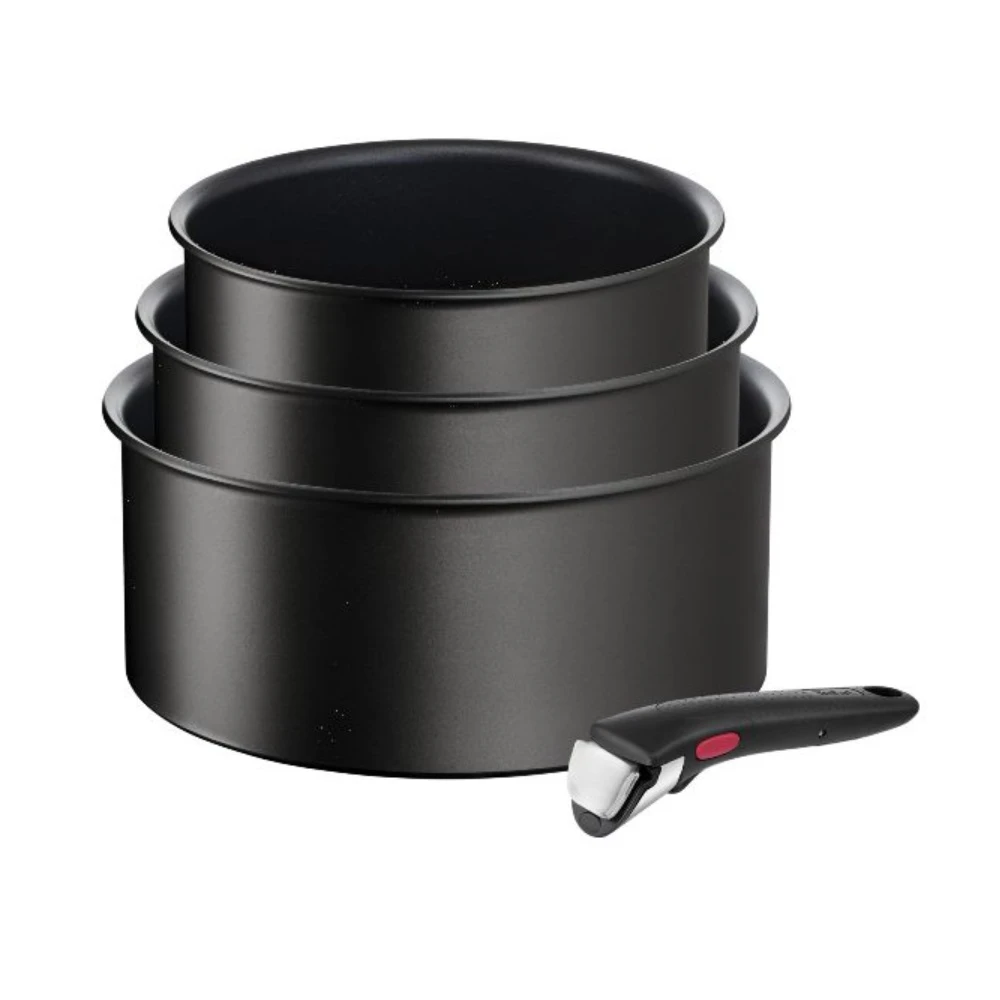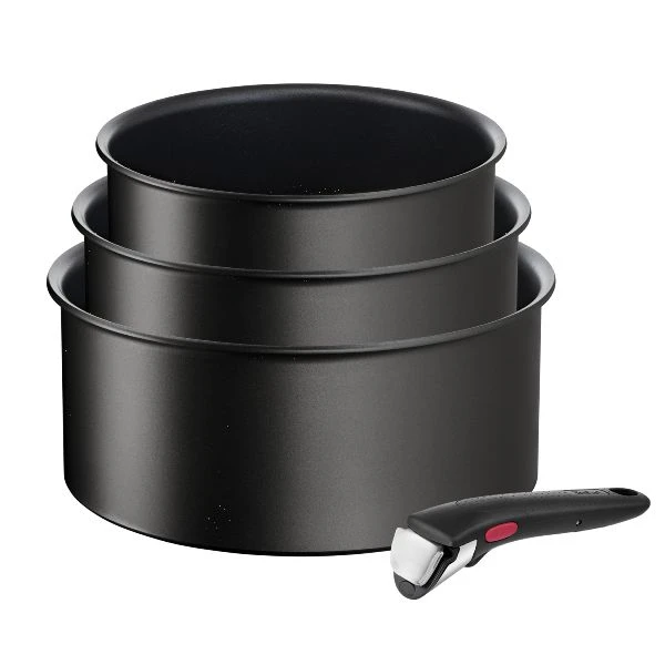 L3979202 – série de 3 casseroles aluminium 16/18/20cm + 1 poignée noir – Série de 3 casseroles 16 à 20 cm + poignée Ingenio Eco Resist L3979202 de Tefal. Vous voulez vous simplifier la vie en cuisine ?. Ingenio est là pour vous aider ! Grâce à sa poignée amovible, vous pourrez cuire sur la plaque de cuisson, gratiner vos recettes au four et conserver les restes au frigo. Et en plus, gagnez de la place dans vos placards grâce à son empilabilité : Ingenio, c’est bien plus qu’une poêle ! Les ustensiles de cette gamme Ingenio Eco Résist vous accompagneront dans la préparation de toutes vos recettes. Une cuisson intensive exige une poêle capable de résister à des conditions extrêmes. Dotée du nouveau revêtement Titanium anti-rayures, les ustensiles Ingenio Eco Resist offrent une durabilité antiadhésive exceptionnelle qui résiste même aux ustensiles en métal. Avec des cristaux ultra-durs assurant une résistance maximale et des performances robustes dans le temps, ce revêtement dure jusqu’à 6 fois plus longtemps. La technologie Thermo-Signal indique la température idéale de démarrage de cuisson pour garantir une texture, une couleur et un goût parfait. Revêtement antiadhésif haute performance à l’intérieur et à l’extérieur pour un nettoyage facile. Induction avancée : la base Thermo-Fusion assure une répartition rapide et optimale de la chaleur sur toute la surface pour des aliments cuits à la perfection. Vendue séparément, la poignée est amovible, robuste et fabriquée pour durer : système de sécurité en 3 points, capable de porter jusqu’à 10 kg, et garantie 10 ans. – Type de produit : Série de 3 casseroles.
