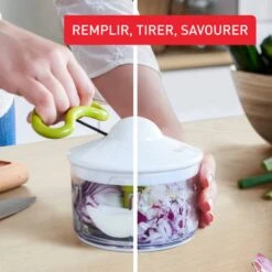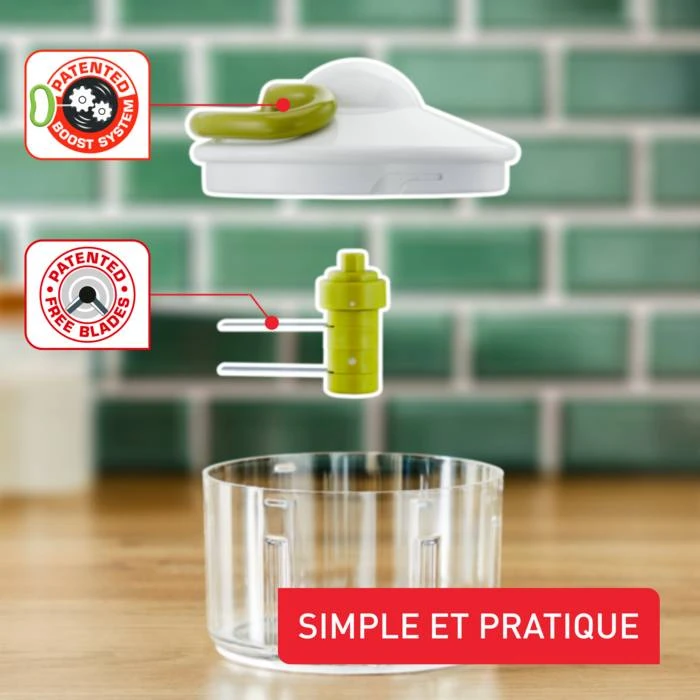 Hachez en quelques secondes: installez la lame, ajoutez les ingrédients, fermez le couvercle, tirez sur la poignée et répétez l&s;opération pour obtenir des résultats plus fins.,Un hachoir manuel qui s&s;attaque aux ingrédients durs comme les noix et les oignons grâce à une technologie de lame robuste et brevetée,Le bol et la lame vont au lave-vaisselle, tandis que le couvercle ne nécessite qu’un simple coup d’éponge ou de chiffon humide,Utilisation sûre avec un système de verrouillage du couvercle et une base anti-dérapante pour une tranquillité d&s;esprit totale,Un hachoir manuel fabriqué pour durer, doté d’un mécanisme robuste garanti pendant 10 ans