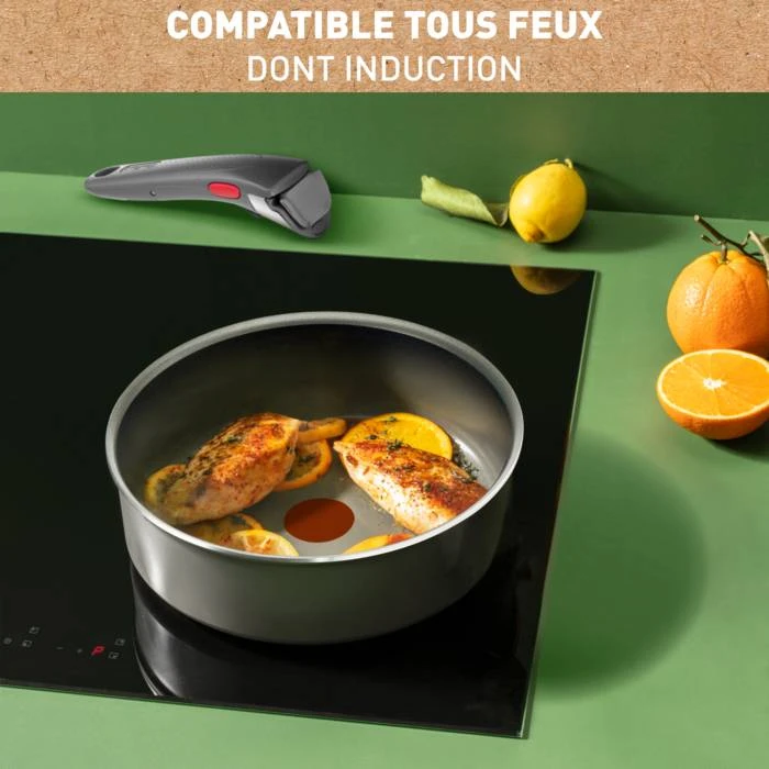 Système de poignée amovible pour une commodité et une polyvalence exceptionnelles au quotidien – de la plaque de cuisson au four et au réfrigérateur en toute simplicité,Une glisse sans effort jour après jour et une cuisine saine et pauvre en matières grasses facilitée par un revêtement céramique antiadhésif de nouvelle génération,Impact environnemental réduit grâce à un corps en aluminium 100 % recyclé*, un produit recyclable** et un emballage en fibres recyclées ; pour en savoir plus sur l&s;éco-conception, consultez le site tefal.com/ecodesign,Compatibilité complète avec les plaques de cuisson à gaz, électriques, vitrocéramique et à induction, ainsi qu&s;avec le four,Poignée amovible robuste (vendue séparément) avec système de sécurité à 3 points, supportant jusqu&s;à 10 kg*** et bénéficiant de notre garantie de 10 ans,L&s;indicateur de température Thermo-Signal™ change de couleur lorsque la poêle atteint la température idéale pour démarrer la cuisson, pour des saisies impeccables,Antiadhésif sans danger : des ustensiles de cuisson de haute qualité, sans danger pour toute la famille, sans PFOA, sans plomb et sans cadmium,Nos produits innovants sont fabriqués en France avec des matériaux de haute qualité et avec le plus grand soin.