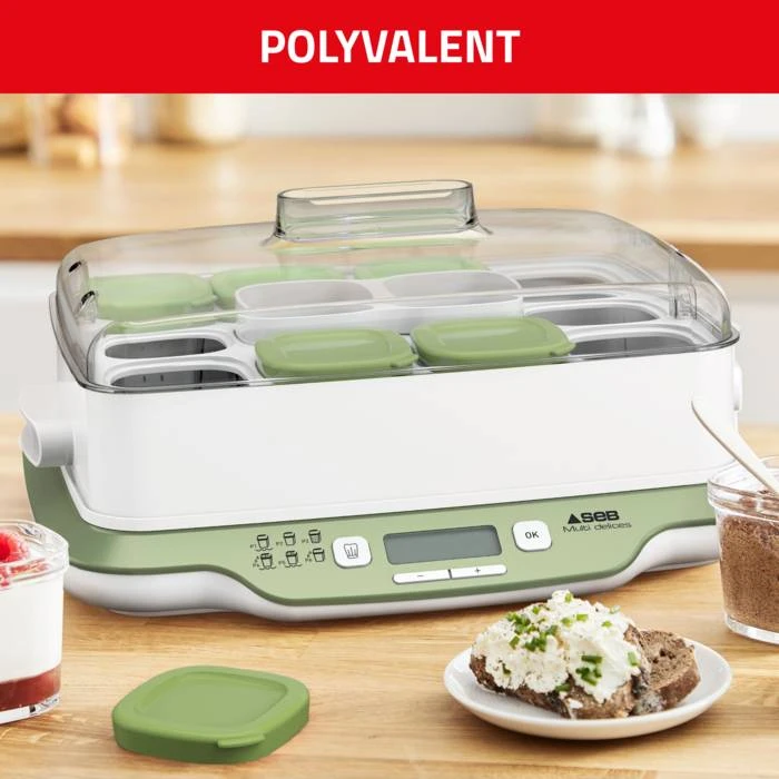 Multi Delices Express & Vegetal est la yaourtière qui saura satisfaire les goûts de chacun ! Obtenez des résultats rapides et faciles et réalisez un large éventail de délicieuses recettes : yaourts, fromages blancs, desserts avec ou sans produits laitiers, ou encore des recettes végétaliennes. Préparez des yaourts maison naturels en deux fois moins de temps*, ainsi que de succulentes recettes végétales en utilisant des boissons à base d’amande, de soja ou d’avoine. Le tout, avec une grande capacité idéale pour régaler toute la famille !