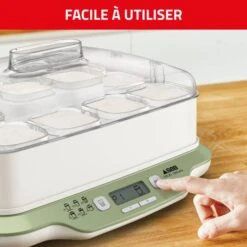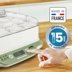 RÉSULTATS RAPIDES : : réalisez vos yaourts en 4 heures seulement avec le programme express (mode express P1), ainsi que de délicieux desserts en 30 à 45 minutes.,CAPACITÉ FAMILIALE : douze pots en verre de 140 ml permettent de préparer des yaourts et des desserts pour une semaine,POLYVALENTE : 6 modes automatiques : Yaourts Express – Yaourts – Fromages blancs – Desserts lactés – Desserts moelleux – Desserts végétaux.,FACILITÉ D&s;UTILISATION : 6 programmes automatiques avec des températures et durées prédéfinies, un écran LCD pour une surveillance facile, ainsi qu&s;une louche et une cuillère doseuse pour une préparation simplifiée,FABRIQUER EN FRANCE ET RÉPARABILITÉ 15 ANS : réparable au juste prix – 15 ans. Conçu pour être réparé. Mise à disposition rapide des pièces à coût limité pendant 15 ans et plus 6200 réparateurs agréés mondiaux,NETTOYAGE FACILE : tous les éléments de la yaourtière passent au lave-vaisselle (sauf la base du produit) pour un nettoyage sans effort,ÉGOUTTAGE BREVETÉ : avec son système d&s;égouttage breveté, vos recettes de fromages blancs sont à votre goût : tournez simplement l&s;égouttoir d&s;un quart de tour dans son pot.,SERENITE TOTALE : yaourtière avec arrêt automatique, produit 100 % sans BPA.