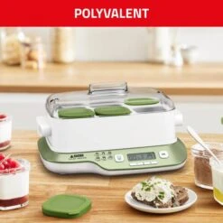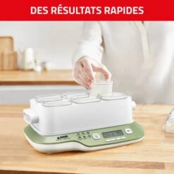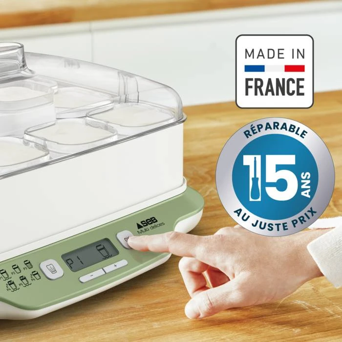RÉSULTATS RAPIDES : réalisez vos yaourts en 4 heures seulement avec le programme express (mode express P1), ainsi que de délicieux desserts en 30 à 45 minutes.,CAPACITÉ : six pots en verre de 140 ml permettent de préparer des yaourts et des desserts pour une semaine.,POLYVALENTE : 6 modes automatiques : Yaourts Express – Yaourts – Fromages blancs – Desserts lactés – Desserts moelleux – Desserts végétaux.,FACILITÉ D&s;UTILISATION : 6 programmes automatiques avec des températures et durées prédéfinies, un écran LCD pour une surveillance facile, ainsi qu&s;une louche et une cuillère doseuse pour une préparation simplifiée,FABRIQUER EN FRANCE ET RÉPARABILITÉ 15 ANS : réparable au juste prix – 15 ans. Conçu pour être réparé. Mise à disposition rapide des pièces à coût limité pendant 15 ans et plus 6200 réparateurs agréés mondiaux.,NETTOYAGE FACILE : tous les éléments passent au lave-vaisselle (sauf la base du produit) pour un nettoyage sans effort.,ÉGOUTTAGE BREVETÉ : avec son système d&s;égouttage breveté, vos recettes de fromages blancs sont à votre goût : tournez simplement l&s;égouttoir d&s;un quart de tour dans son pot.,SERENITE TOTALE : yaourtière avec arrêt automatique, produit 100 % sans BPA. ,INCLUS : six pots en verre de 140 ml avec couvercle, 6 égouttoirs, une louche, une cuillère doseuse, un livre de recettes.