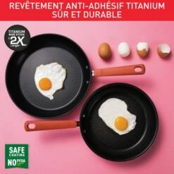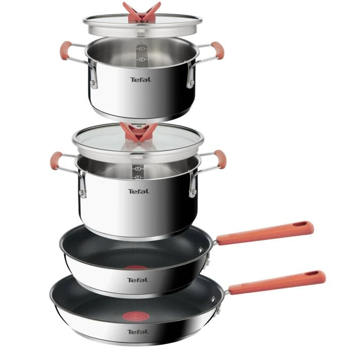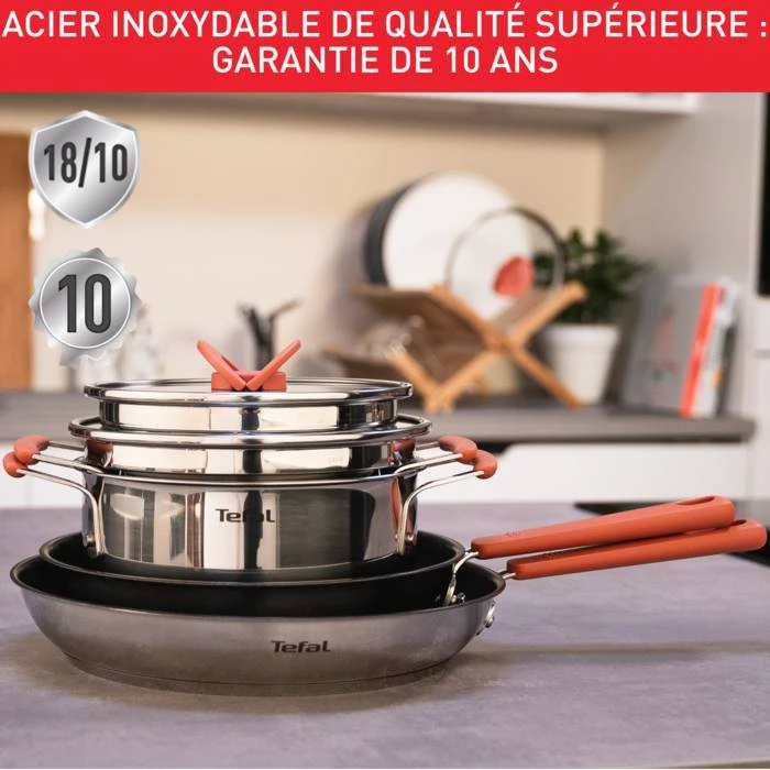 Batterie de cuisine peu encombrante, conçue pour être empilée et rangée facilement dans vos placards de cuisine,L&s;indicateur de chauffe Thermo-Signal (poêles uniquement) change de couleur lorsque la poêle atteint la température idéale pour lancer la cuisson. Fonctionne avec les plaques à induction,Revêtement anti-adhésif extrêmement robuste qui dure trois fois plus longtemps (par rapport au revêtement anti-adhésif standard de Tefal) pour des performances longue durée, un nettoyage facile et une glisse impeccable,Revêtement anti-adhésif sûr (poêles à frire uniquement) : Ustensile de cuisine de haute qualité, sans danger pour toute la famille, sans PFOA, plomb ou cadmium,Base épaisse Thermo-Fusion pour une cuisson rapide et homogène et des performances longue durée, compatible avec tous les types de cuisinières,Poignées antidérapantes et anti-chaleur pour une sécurité totale et un confort optimale pendant la cuisson