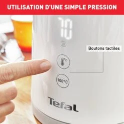 Profitez de boissons chaudes Ă la tempĂ©rature idĂ©ale, parfaitement adaptĂ©es Ă tous les goĂ»ts, grĂące Ă la bouilloire Ă©lectrique Tefal, moderne, intuitive, et aussi raffinĂ©e qu’innovante. Avec un Ă©cran numĂ©rique intĂ©grĂ© minimaliste indiquant la tempĂ©rature rĂ©elle de l’eau Ă l’intĂ©rieur, cette bouilloire propose une plage de cinq rĂ©glages de tempĂ©rature allant de 40 Ă 100 °C. Elle est parfaite pour chauffer de l’eau sur simple pression d’un bouton. Sa structure Ă double paroi maintient la chaleur Ă l’intĂ©rieur tout en assurant une surface extĂ©rieure froide au toucher pour une sĂ©curitĂ© optimale. Cet appareil comprend Ă©galement d’autres fonctions bien pensĂ©es, comme le maintien de la tempĂ©rature pendant 30 minutes afin que vos boissons soient prĂȘtes lorsque vous l’ĂȘtes, un couvercle Ă ouverture automatique pour un remplissage facile, une base pivotante Ă 360° et un arrĂȘt automatique pour une utilisation en toute sĂ©rĂ©nitĂ©. Et grĂące Ă une grande capacitĂ© de 1,5 L, elle est idĂ©ale pour rĂ©pondre Ă toutes vos envies. Tefal – la bouilloire Ă©lectrique moderne et simple.